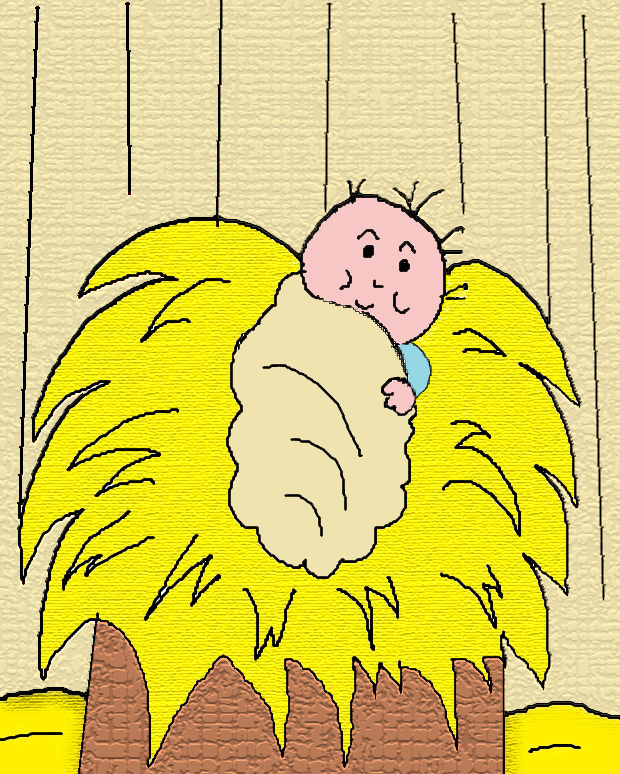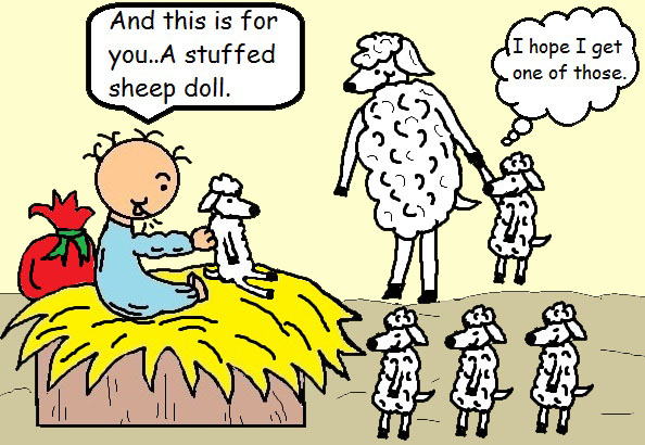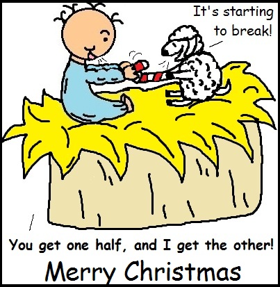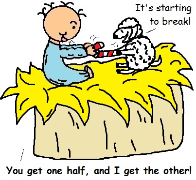 Baby Jesus and His Sheep Trying To Break A Candy Cane In Half Clipart