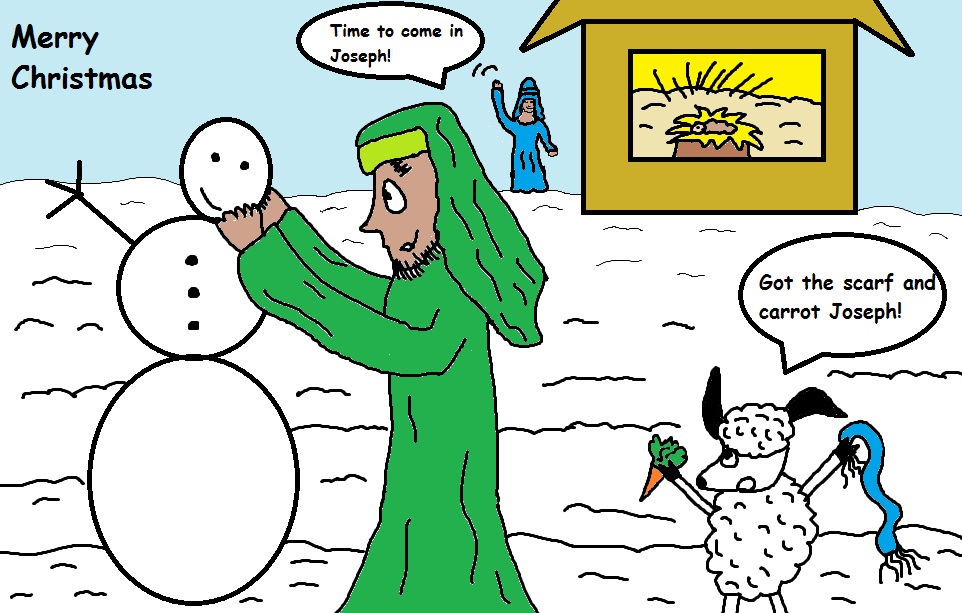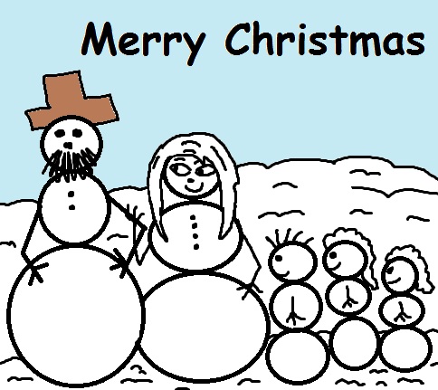 Baby Jesus And His Sheep Building A Snowman Together Clipart